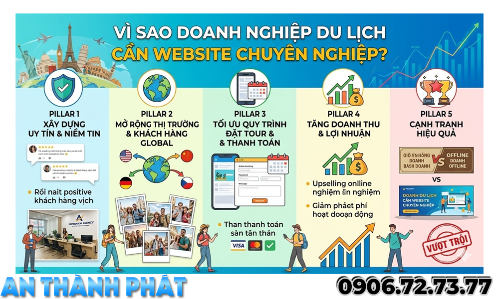 Trong bối cảnh ngành du lịch ngày càng cạnh tranh, việc sở hữu một website chuyên nghiệp là yếu tố quan trọng giúp doanh nghiệp phát triển bền vững. Website không chỉ giúp giới thiệu dịch vụ mà còn là công cụ marketing mạnh mẽ giúp doanh nghiệp tiếp cận khách hàng và gia tăng doanh thu.